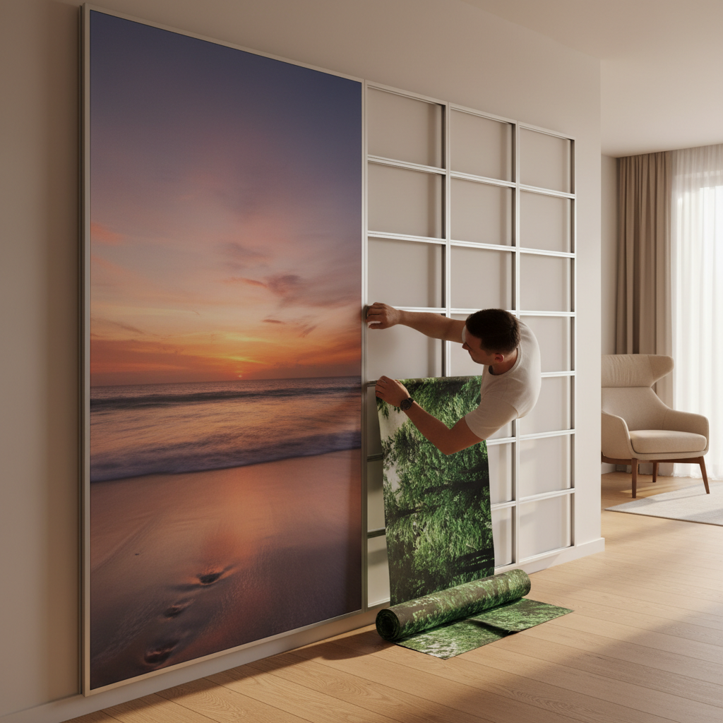 TextileWall to nowoczesny system dekoracji ścian oparty na aluminiowym profilu i wymiennej grafice tekstylnej. W przeciwieństwie do tradycyjnych tapet, nasz system pozwala zmienić wygląd ściany w kilka minut – bez remontu, bez kleju i bez bałaganu.